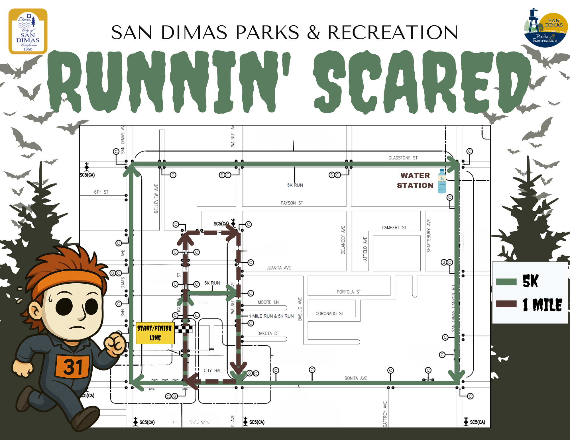 Join us on September 27 from 7:30 AM to 10:00 AM at Civic Center Park (245 E. Bonita Ave.) for a spooky morning of fun and fitness! Whether you're racing the 5K, taking it easy with the 1 Mile, or watching your little ones shine in the Toddler Trot, there's something for everyone.